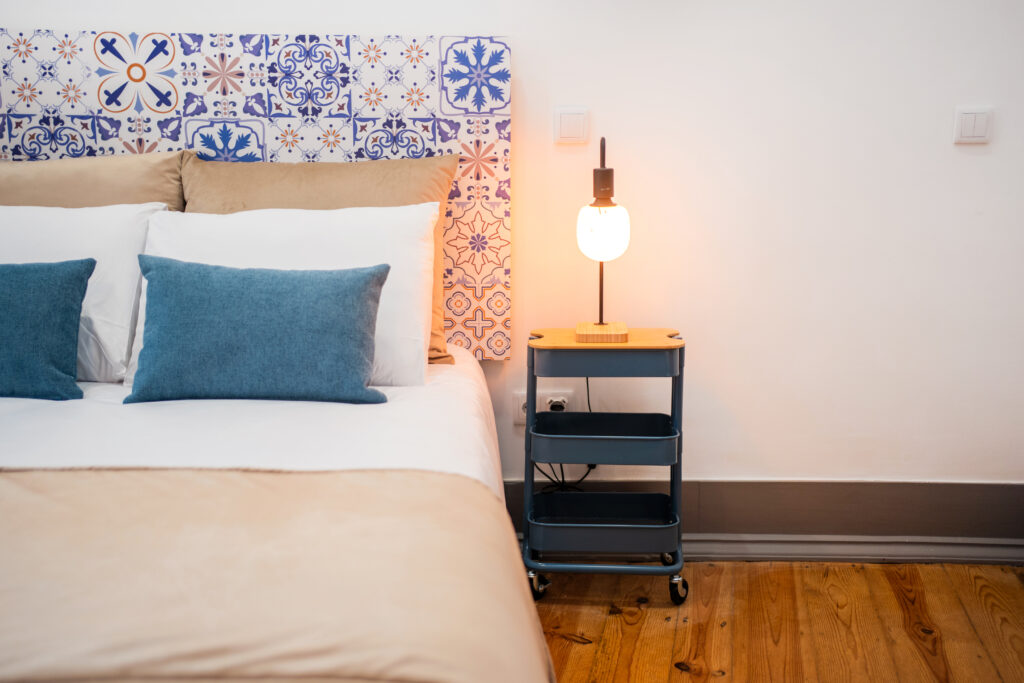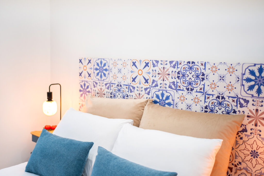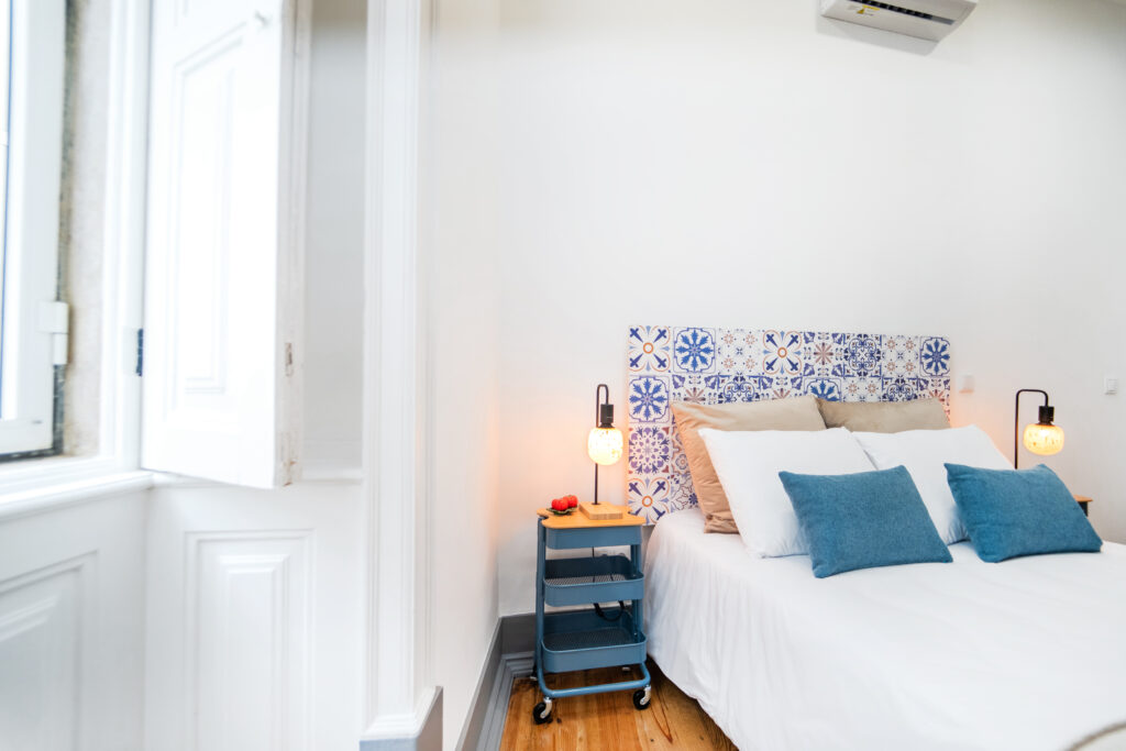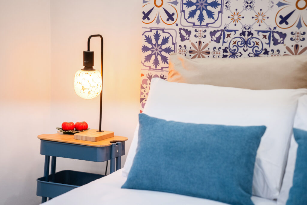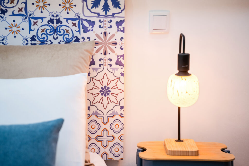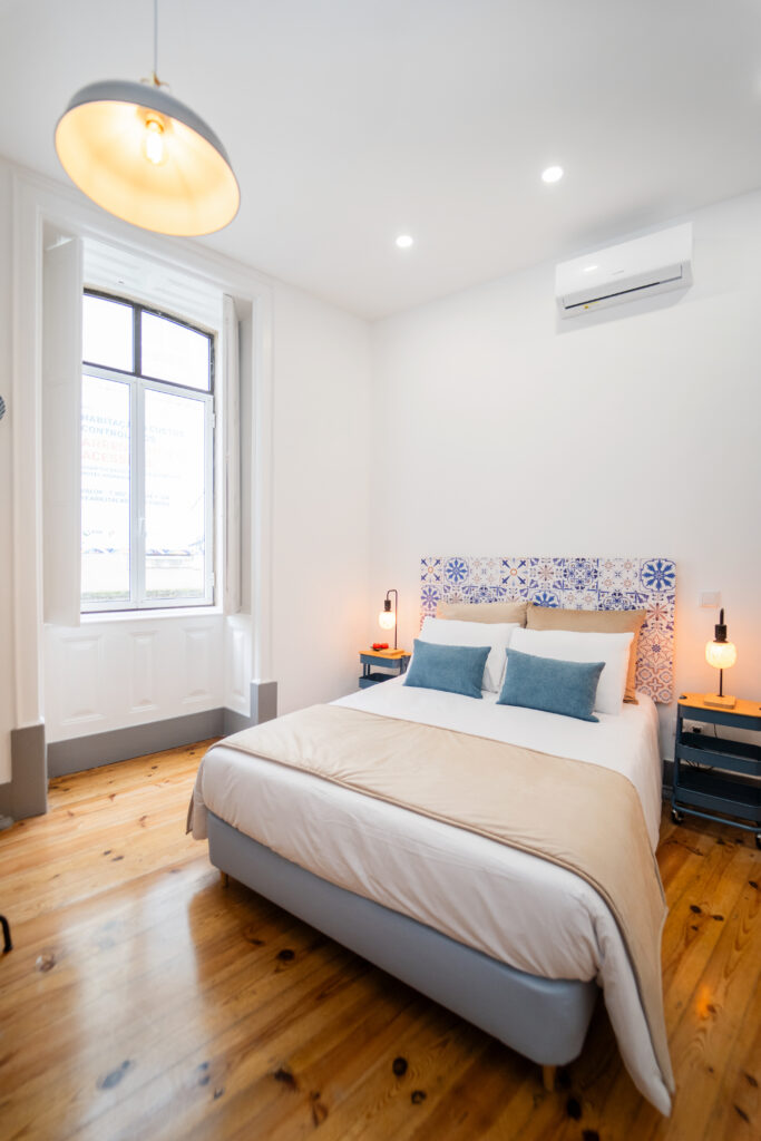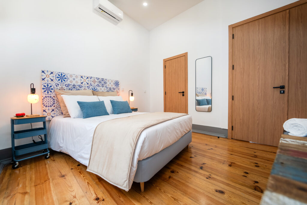 A decoração de azulejo antigo estende-se pela casa de banho, criando uma harmonia entre o passado e o presente, como se o próprio mercado tivesse sido transposto para o interior do quarto.