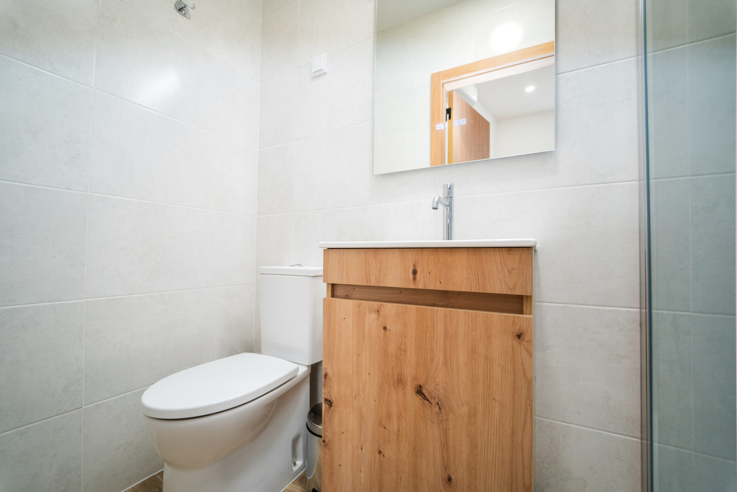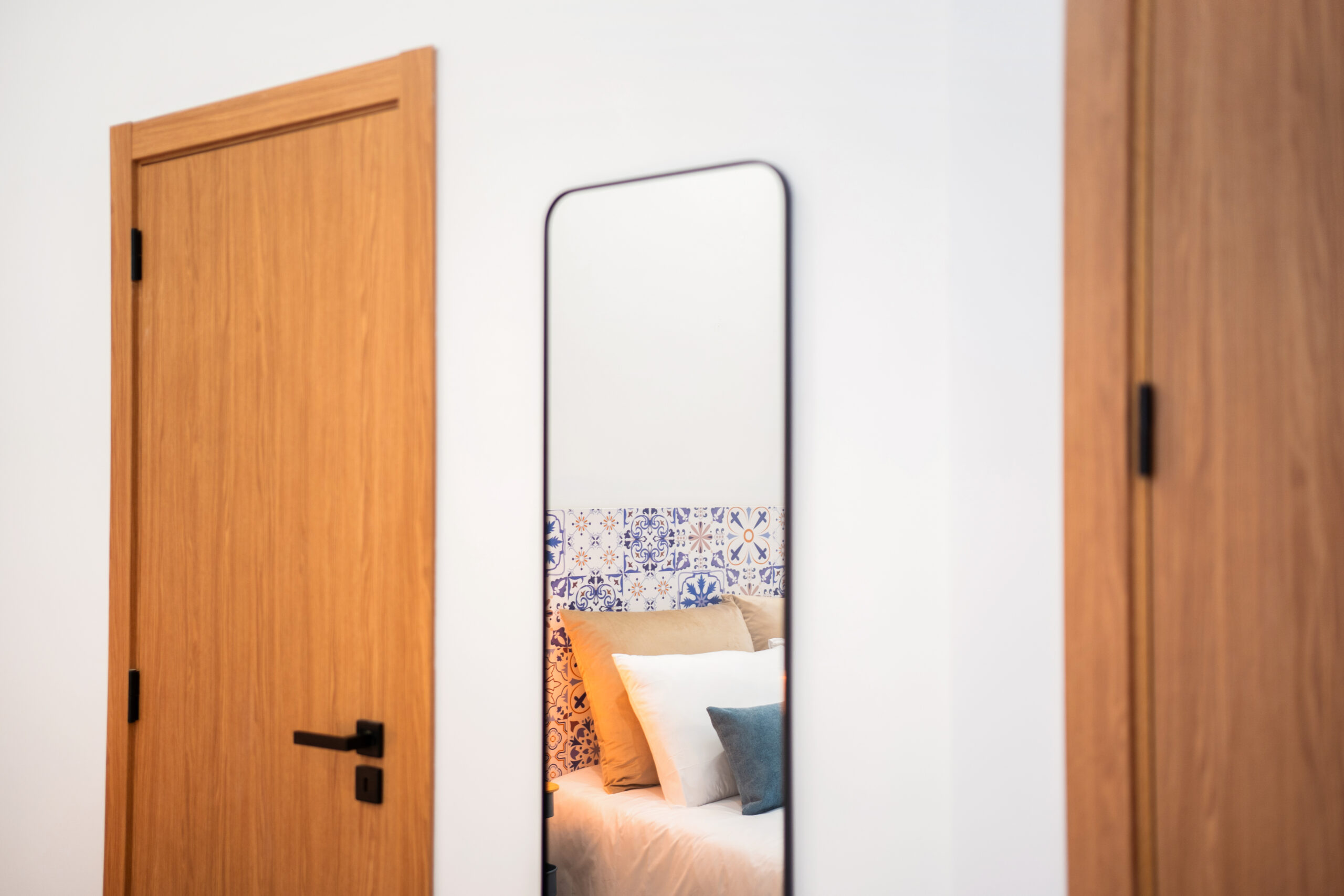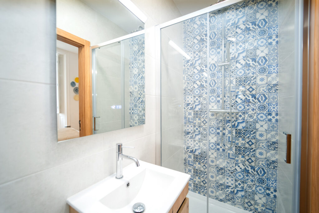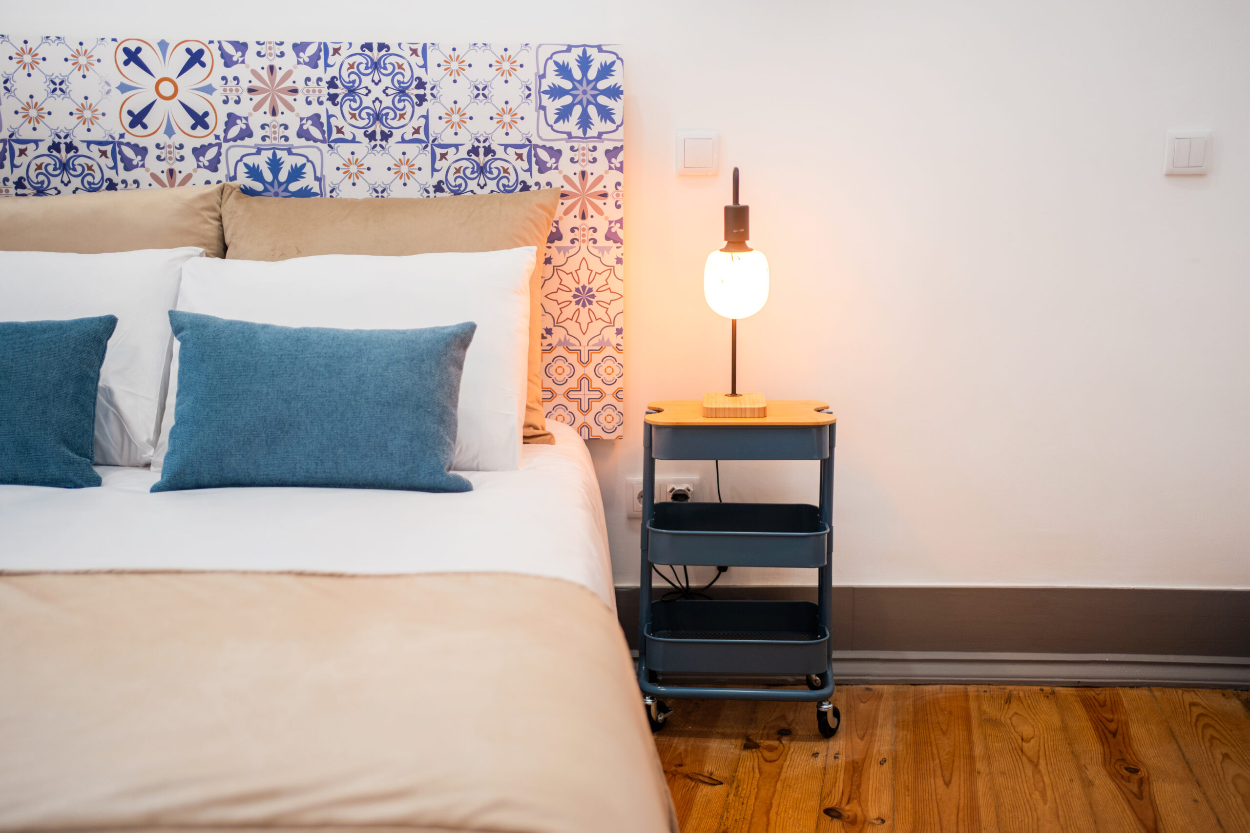 A decoração de azulejo antigo estende-se pela casa de banho, criando uma harmonia entre o passado e o presente, como se o próprio mercado tivesse sido transposto para o interior do quarto.