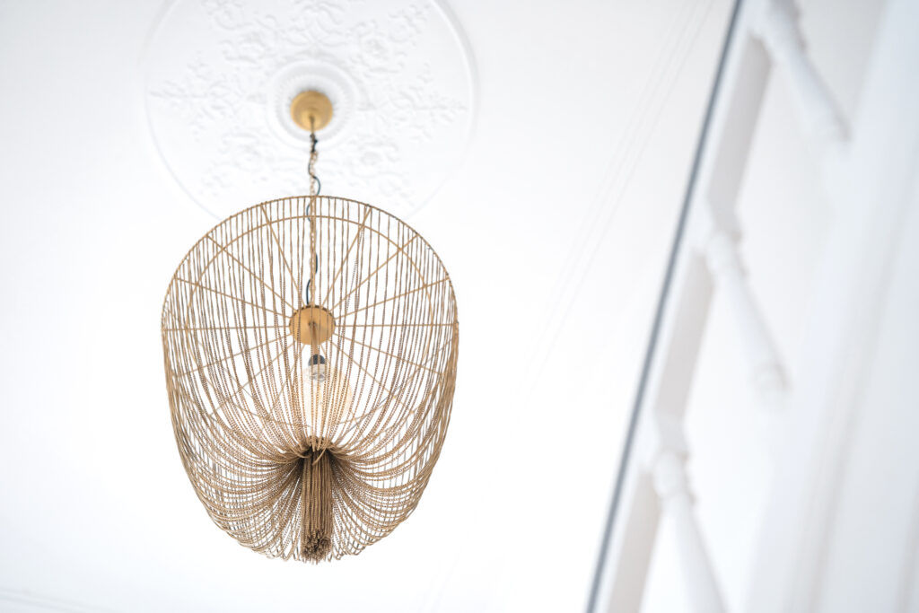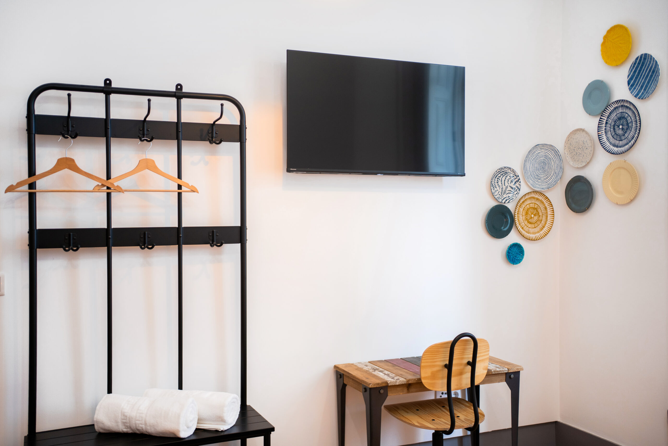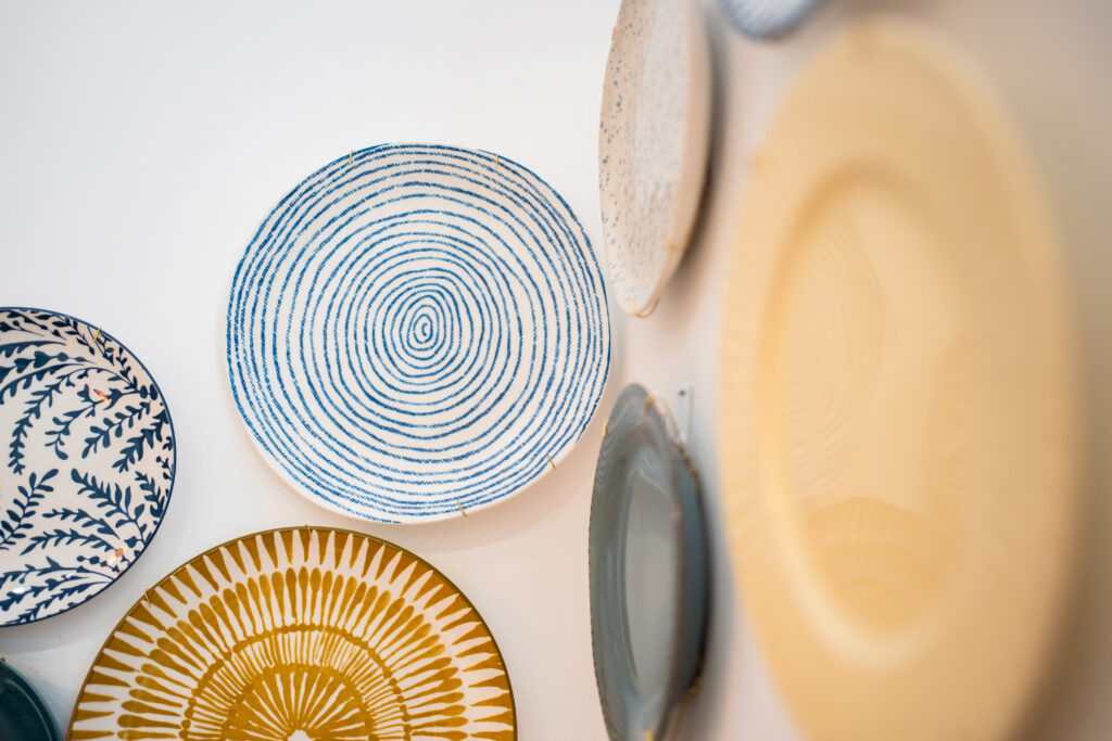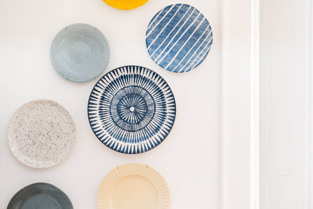 Na parede oposta, uma composição de pratos na parede, reminiscente das casas de outrora, traz à memória as tradições e as peripécias que aconteciam nas bancas e entre os corredores do mercado.