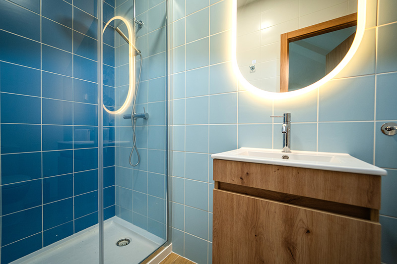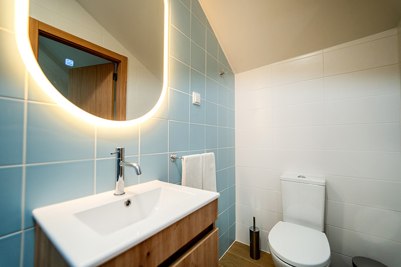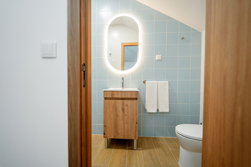 A casa de banho, generosa em tamanho, é um convite a um banho de mar interior, onde poderá mergulhar no conforto e nas sensações que o oceano nos proporciona.